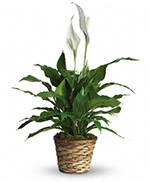 Also known as the peace lily, this dark leafy plant with its delicate white blossoms makes a simply elegant gift. There's nothing small about the sentiment delivered along with this pretty plant. A brilliant green spathiphyllum is delivered in a natural wicker basket. Long live elegance!...